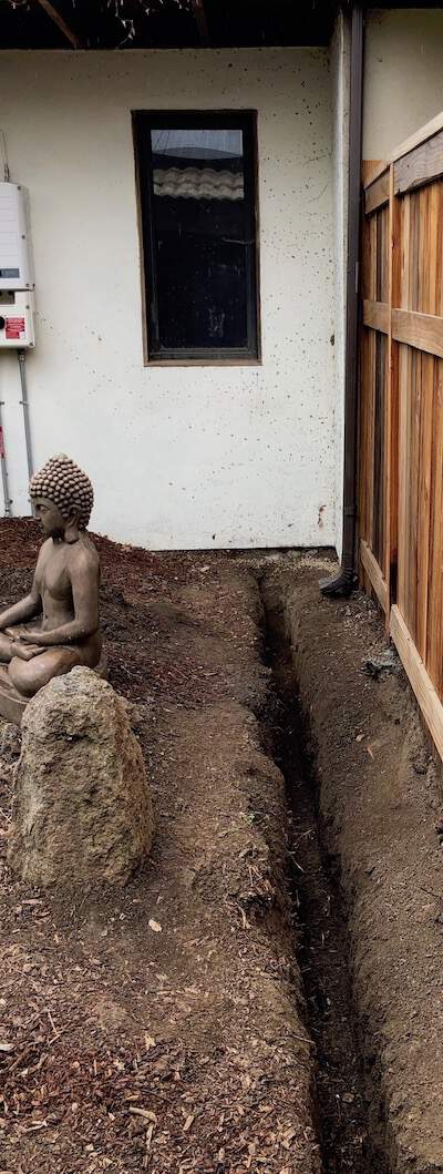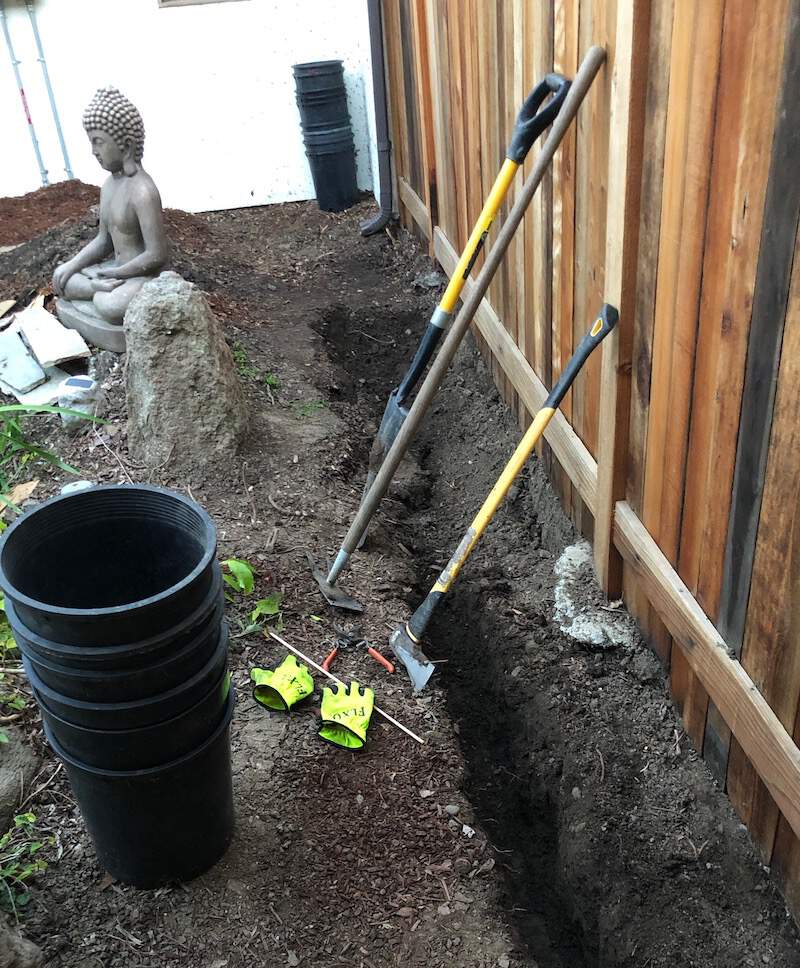 Where to put all the soil that was removed from the trench? One idea was to use the soil from the trench to fill in the pond. Ponds require a lot of maintenance and we were not sure we were willing to do the work that was needed. Filling up the pond with the soil from the trench would solve the problem of where to put the soil!