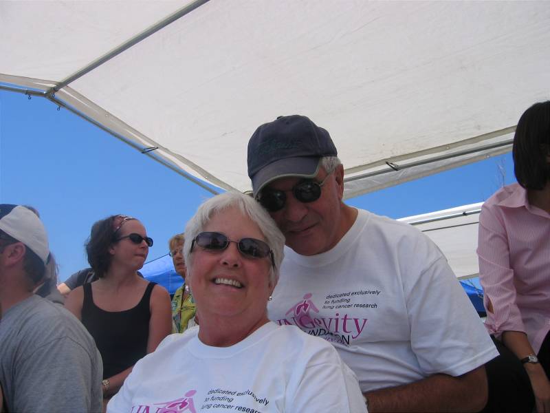 Waiting for Bjorn to finish the marathon, Elin and Joe are wearing T-shirts from Lungevity, the organization that will receive the sponsor money.