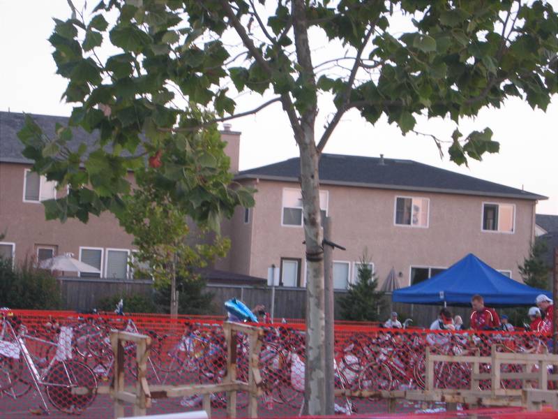 This is a picture of the transition area from bike to run. See that blue splotch lower center? That is a dolphin balloon that Marissa got to mark where Bjorn left his running gear.