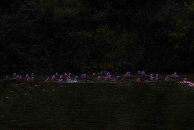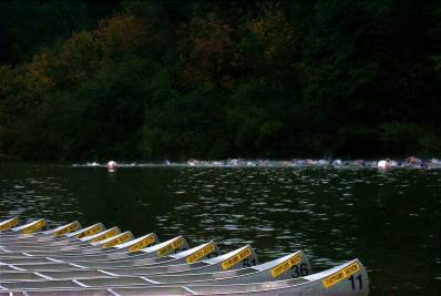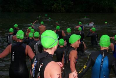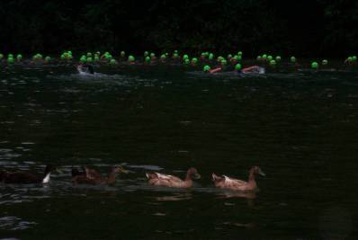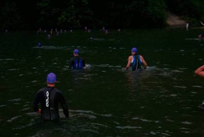 They're off on a 2.4 mile swim. Two laps downstream and upstream in the Russian River. The current was not very strong because the river was partially dammed.