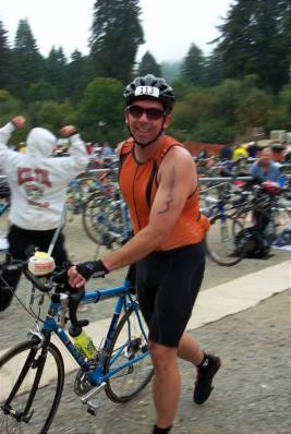 Smiling and ready. It is now 8:15. He will ride for 112 miles through the countryside. He has lots of water and food to keep him going.