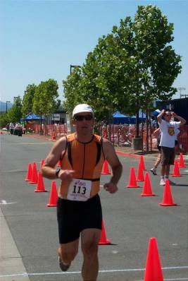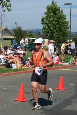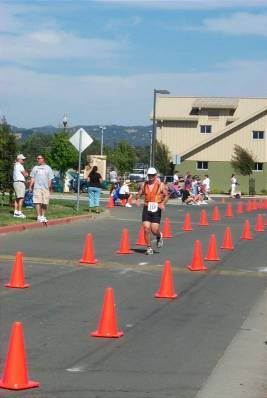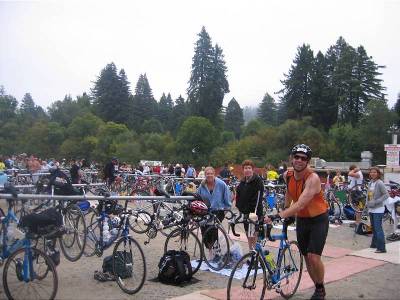 This is a picture of the transition area from bike to run. See that blue splotch lower center? That is a dolphin balloon that Marissa got to mark where Bjorn left his running gear.